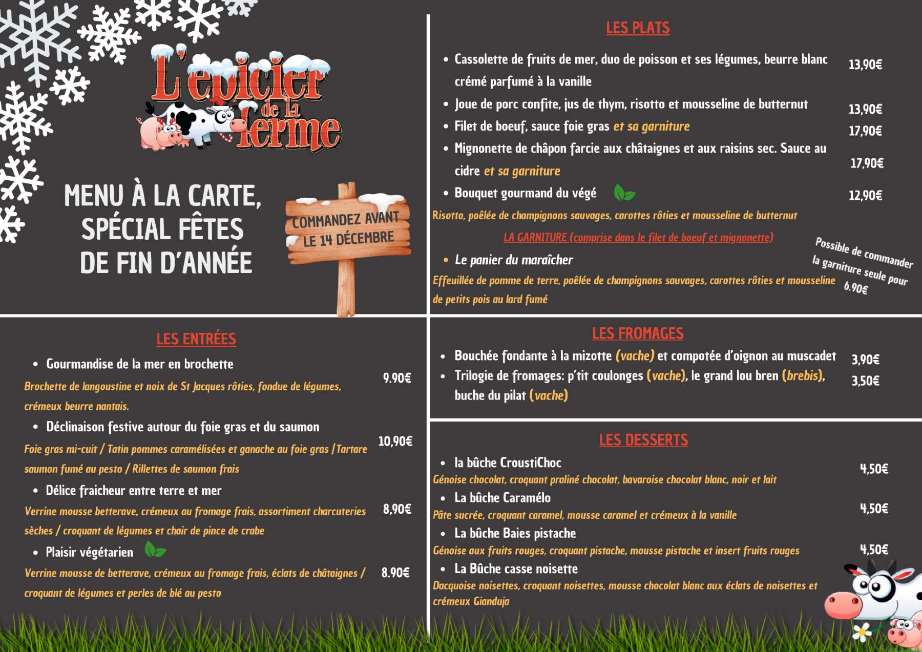 Retrouver notre menu à la carte, spéciale fêtes de fin d'année et envoyer nous votre bon de commande rempli avant le 12 décembre.